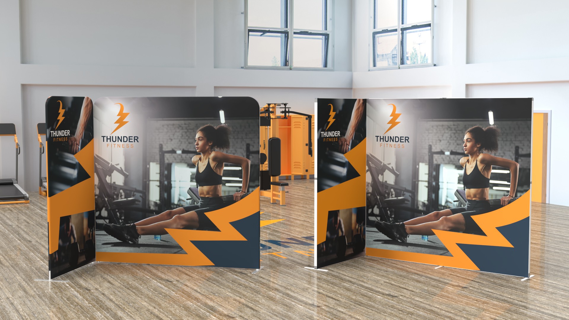The client was looking for a Gym inspired design, but they wanted to see options on a few products available at Showdown Displays. This design was created in Illustrator to template. The models were created in blender and staged in Substance Stager.