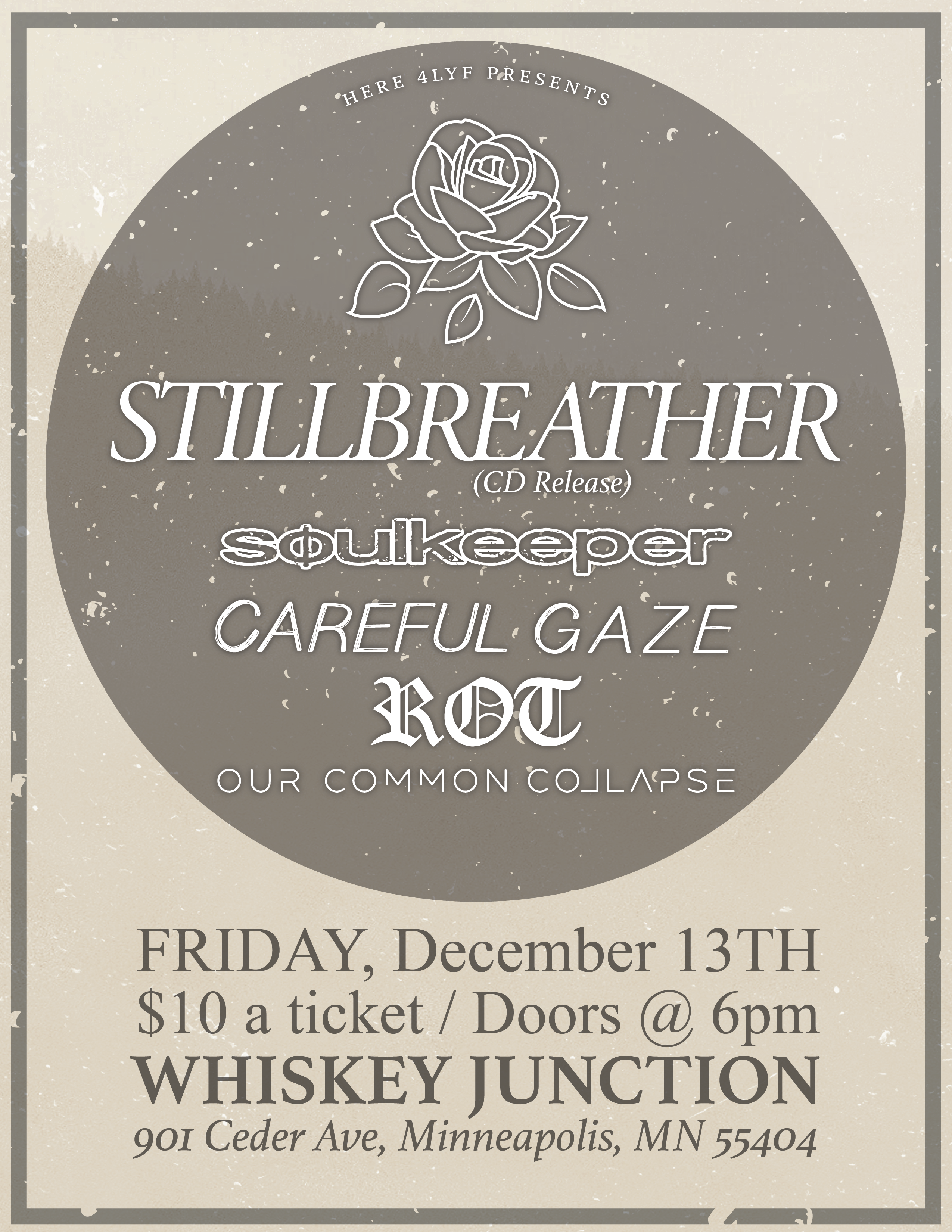 A flyer designed for Stillbreather. they had a CD release show and needed a flyer that was similar to their album art. I created this using some assets from the band in Illustrator.